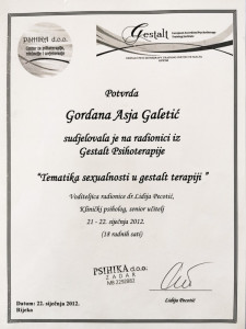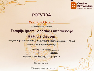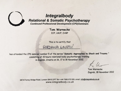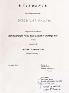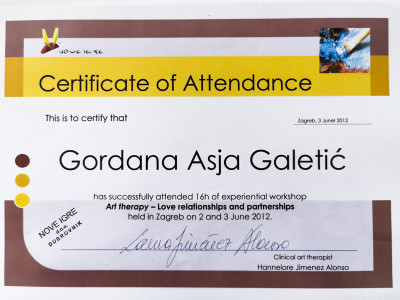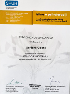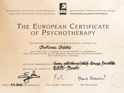 Ovdje možete vidjeti moj europski certifikat psihoterapeuta, uvjerenje o sub-specijalističkom treningu iz Imago terapije odnosa-partnerskoj terapiji te izdvojena uvjerenja o drugim dragim mi stručnim usavršavanjima.