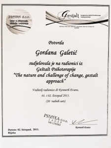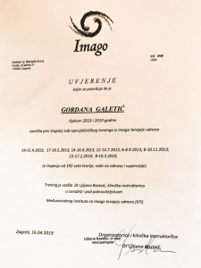 Ja sam Gordana Galetić, certificirana psihoterapeutkinja (ECP – europska diploma 2013.g.) završila subspecijalizaciju iz Imago terapije odnosa – oblika bračnog savjetovanja i ujedno metode koja omogućava (još) kvalitetnije privatne i poslovne odnose.